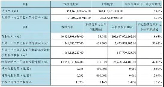 10月29日,京东方科技集团股份有限公司(京东方A:000725;京东方B:200725)发布2020年第三季度业绩报告。报告显示,2020年前三季度,BOE(京东方)实现营业收入1016.88亿元,同比增长18.63%;归属于上市公司股东的净利润24.76亿元,同比增长33.67%。其中,第三季度实现营业收入408.21亿元,同比增长33.04%;归属于上市公司股东的净利润13.4亿元,同比增长629.30%;归属于上市公司股东的扣除非经常性损益的净利润10.64亿元。
